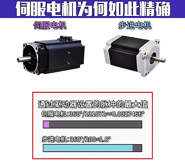 伺服和步進(jìn)所指電機(jī)部分,伺服電機(jī)和步進(jìn)電機(jī)一樣都是電機(jī)走一圈,脈沖數(shù)越大每一步的角度就越小精度就越高,而伺服電機(jī)軸后端如果是17位編碼器的話,那么驅(qū)動(dòng)器每接收131072個(gè)脈沖信號(hào)電機(jī)才轉(zhuǎn)一圈,也就是它走一下,僅移動(dòng)了0.0027°,那么它步進(jìn)角為1.8°步進(jìn)電機(jī)的655倍,而大部分步進(jìn)電機(jī)只能設(shè)置到25000個(gè)脈沖, 所以說伺服電機(jī)的精度是步進(jìn)電機(jī),同時(shí)伺服電機(jī)是閉環(huán)控制,有效的反饋也了電機(jī)。
